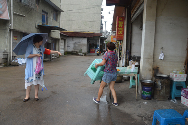 在一家早餐店門口,餐桌擺到了行車道上,呂主席上去勸導(dǎo),老板立即把凳子搬到室內(nèi)