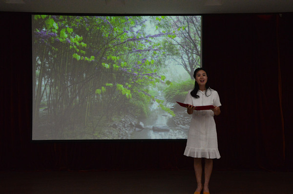 “從窗口望去,滿目蔥郁,一片綠海;柔疏條隨風搖曳,婆娑起舞;密葉團團簇簇,欣欣向榮”,自創(chuàng)詩歌《綠》通過選手對情境的描繪,仿佛讓聽眾置身于綠的海洋,看到了“綠水青山就是金山銀山”的美麗麗水,同時也揭開了比賽的序幕。