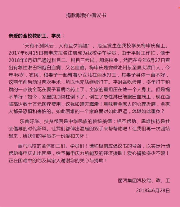 6月27日,麗汽集團(tuán)汽車技術(shù)學(xué)校的微信公眾號收到一條來自學(xué)員的消息:“我是麗汽汽校的一名學(xué)員,突患急性淋巴細(xì)胞白血病,希望汽校領(lǐng)導(dǎo)能幫我籌點款,謝謝!”