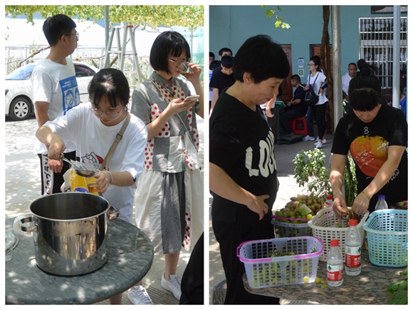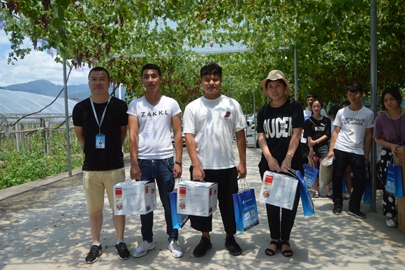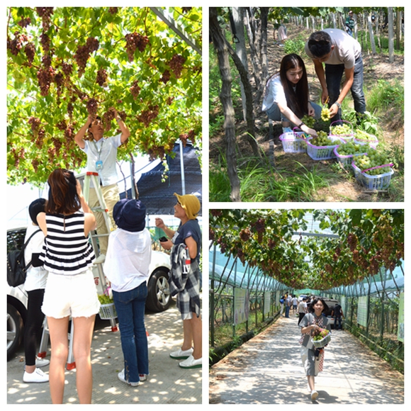 “這個好甜!” “我喜歡這個品種的味道!”學(xué)員們一到達(dá)葡萄園,工作人員們就端來了沏好的端午茶和剛采摘的新鮮葡萄……學(xué)員們迫不及待的品嘗起來。