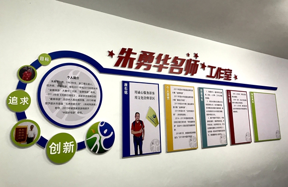 8月8日,旅游集散中心有限公司 “朱勇華名師工作室”的墻面布置完成,標(biāo)志著名師朱勇華有了自己的帶徒工作室。