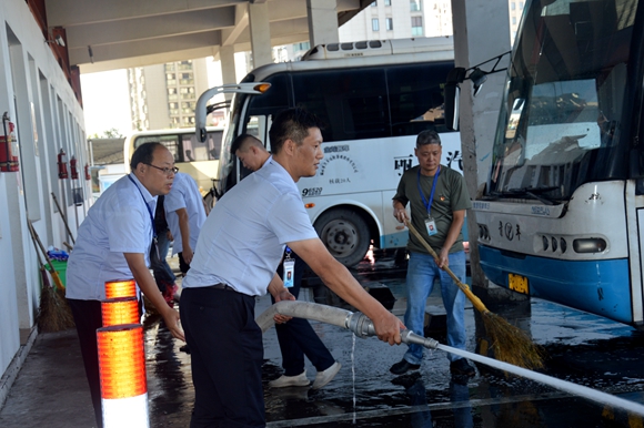 “一二三,加油……” ,“這里有一堆垃圾,快點拿掃把過來……”。為深入推進創(chuàng)建文明城市,不斷提升社區(qū)環(huán)境面貌,迎接“國慶70周年”和文明城市測評,9月23日下午,長運(東站)組織員工開展衛(wèi)生大清掃活動,清理站區(qū)內(nèi)垃圾。活動中,大家手拿掃把、鋤頭和垃圾鉗,運用消防水帶,重點對站場地面油污、綠化帶上的雜草、垃圾桶臟污破損等問題,進行了全面排查和清理。她們相互協(xié)作,或清除路面的煙頭雜物,或徒手將雜草和泥土裝運上車……不一會兒,大家的衣衫都被汗水浸濕,但勞動熱情依然十分高漲。經(jīng)過近兩個小時的全力奮戰(zhàn),侵占道路的垃圾、雜物全部被清理干凈。