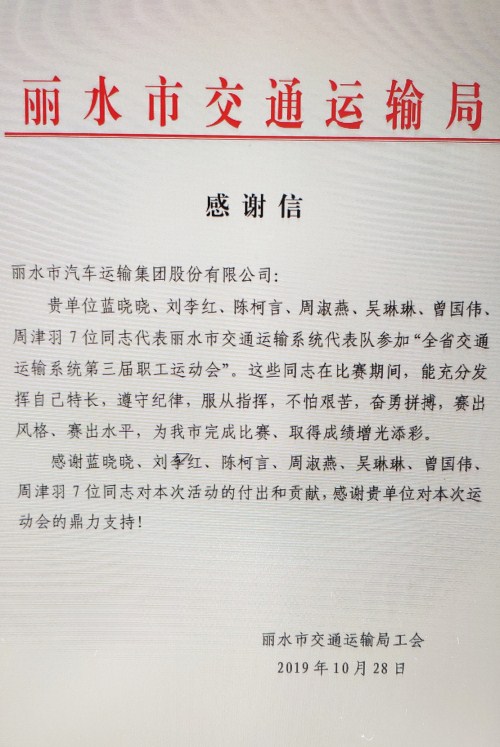 2019年10月24日,麗汽集團藍(lán)曉曉、劉李紅、曾國偉等員工參加浙江省交通系統(tǒng)第三屆職工運動會,本屆運動會麗水市交通局代表隊共派出28名運動員,其中麗汽運動員7名。