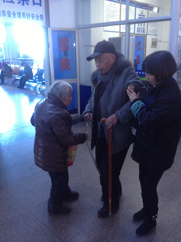 蔡美娟攙扶著老大爺,他老伴拉著繩子,走一步提一下大爺?shù)挠夷_緩慢的行走著。就這樣,蔡美娟扶著老大爺走幾步,就要稍停一下,等老大爺喘下氣再繼續(xù)走。由于13號檢票口位于東站候車廳的最里面,從售票廳走過去還是有100多米的樣子。一路上老大爺不停的問到了沒有,蔡美娟感覺到老大爺雖然有她扶著可還是有點吃不消了,就不斷的鼓勵老大爺:“再堅持一下,我們就要到了!”就這樣,短短的100多米,他們?nèi)齻€人卻艱難的走了五六分鐘。(相關(guān)視頻已經(jīng)上傳在群空間)