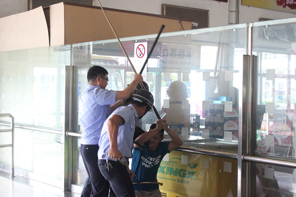 行車員發(fā)現(xiàn)普客候車廳內(nèi)有一名醉酒男子情緒激動揮舞木棍,危及旅客安全,立即跑向調(diào)度室向業(yè)務(wù)站值班站長報告,值班站長接到報告后通過對講機向其它崗位呼叫。并立即組織本部門值班人員趕到現(xiàn)場將旅客疏散到安全的區(qū)域;保衛(wèi)科接到報告后立即做出回應(yīng),啟動反恐防范應(yīng)急預(yù)案,攜帶反恐防范器具前往現(xiàn)場控制住施暴者;同時由2名保衛(wèi)人員組成警戒協(xié)調(diào)組也到達(dá)現(xiàn)場負(fù)責(zé)外圍的警戒工作。