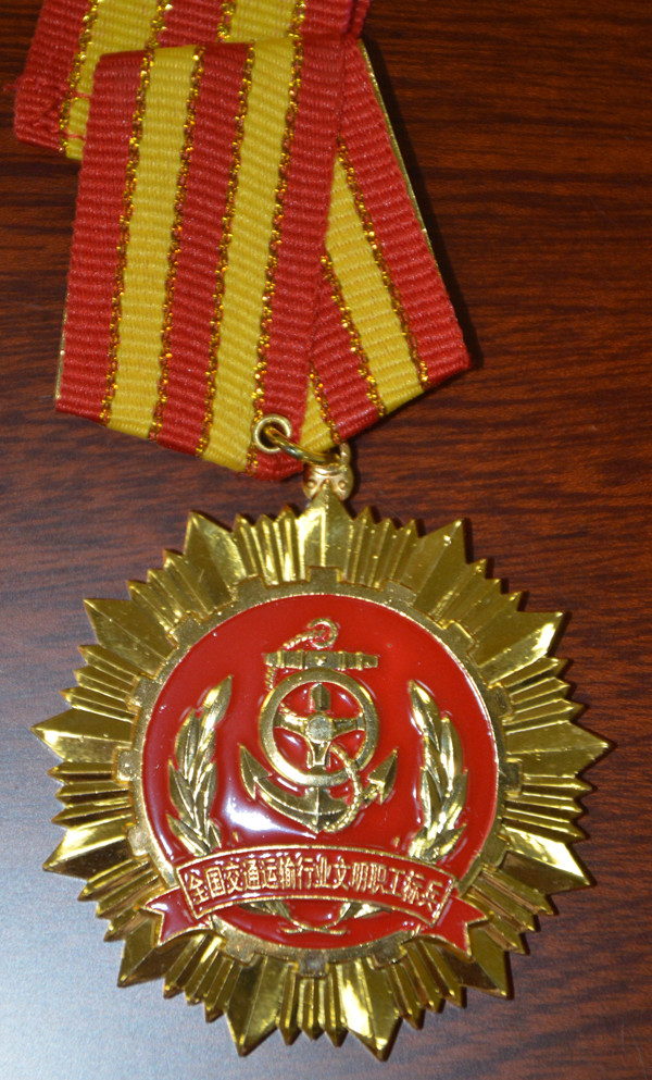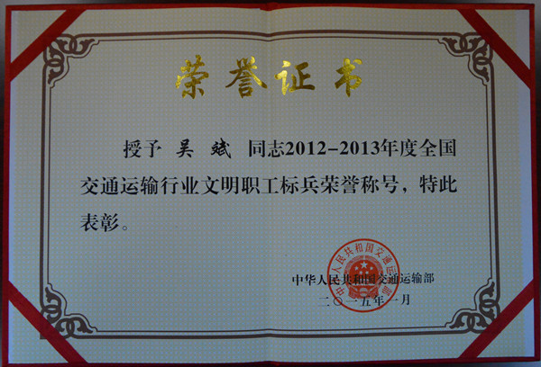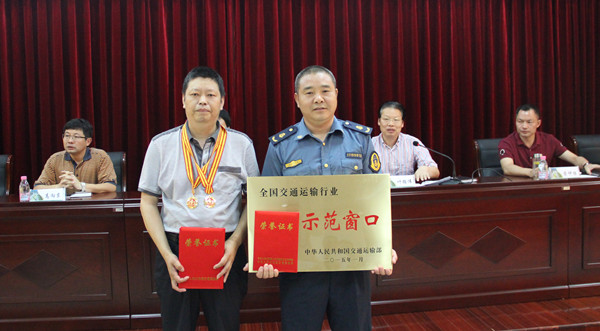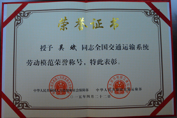 吳斌(左)榮獲全國交通運輸系統(tǒng)勞動模范、全國交通運輸行業(yè)文明職工標(biāo)兵稱號
