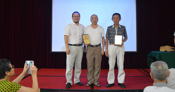 葉茂書記給徐時聽、曾樹生兩位黨員送上“光榮入黨五十周年”紀念牌
