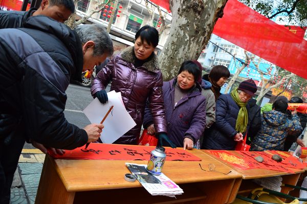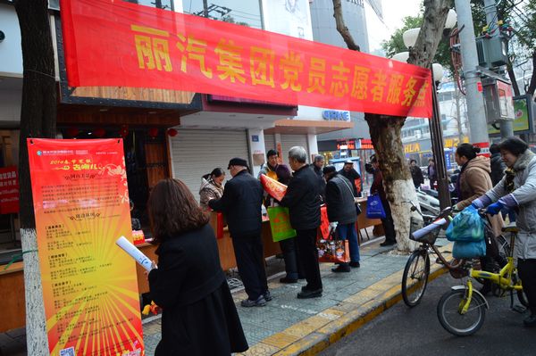 “貼上真正寫的春聯(lián),才有過年的味道”,一位排隊(duì)等候的姑娘對蘭老的字情有獨(dú)鐘。家住白云小區(qū)的齊大媽更是感慨自己已65歲,上還有90歲高齡母親,非要請?zhí)m老寫下:“今日正逢萱草壽,前身合是杏花仙”,橫披“九十大壽”對聯(lián),作為母親九十大壽的賀禮。拿到對聯(lián)后的齊大媽稱心滿意地說:“今天我非常高興、開心,你們這么冷的天為我們義務(wù)寫對聯(lián),抽出休息時間為人民服務(wù),祝福你們麗汽集團(tuán)生意越做越大?!?br/> 黨員們在中山街上頂著寒風(fēng),冒著嚴(yán)寒,不斷為市民們送福字,寫對聯(lián),送對聯(lián),把暖暖的祝福送給市民。據(jù)統(tǒng)計(jì),集團(tuán)公司黨員服務(wù)一條街,送出“福”字1500余張,送出對聯(lián)200余副,發(fā)放班車時刻表、旅游信息表等1000余張。