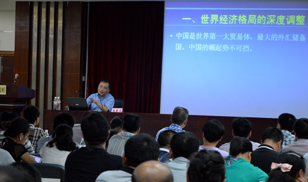 在上課過程中,陳敬東教授圍繞世界經(jīng)濟格局的深度調(diào)整、中國經(jīng)濟的換檔期和陣痛期、大膽創(chuàng)新落實改革意圖、中國經(jīng)濟的發(fā)展趨勢分析及新形勢下企業(yè)如何應(yīng)對挑戰(zhàn)等五個方面對當(dāng)前宏觀經(jīng)濟形勢進行了分析講解。在企業(yè)如何應(yīng)挑戰(zhàn)中,陳教授指出:在當(dāng)前形勢下,企業(yè)應(yīng)從培育新的意識、找準新的定位、制定新的戰(zhàn)略、開發(fā)新的產(chǎn)品和服務(wù)、建立新的品牌等方面進行努力,迎接新一輪挑戰(zhàn)。